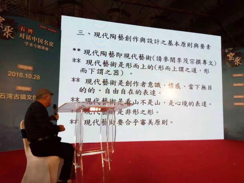 由廣東石灣陶瓷博物館等主辦的石灣對話中國名窯學術專題講座,今天下午在石灣古鎮文創園舉行。著名臺灣陶藝家李茂宗,正在闡述現代陶藝理念和中國陶藝之興起。